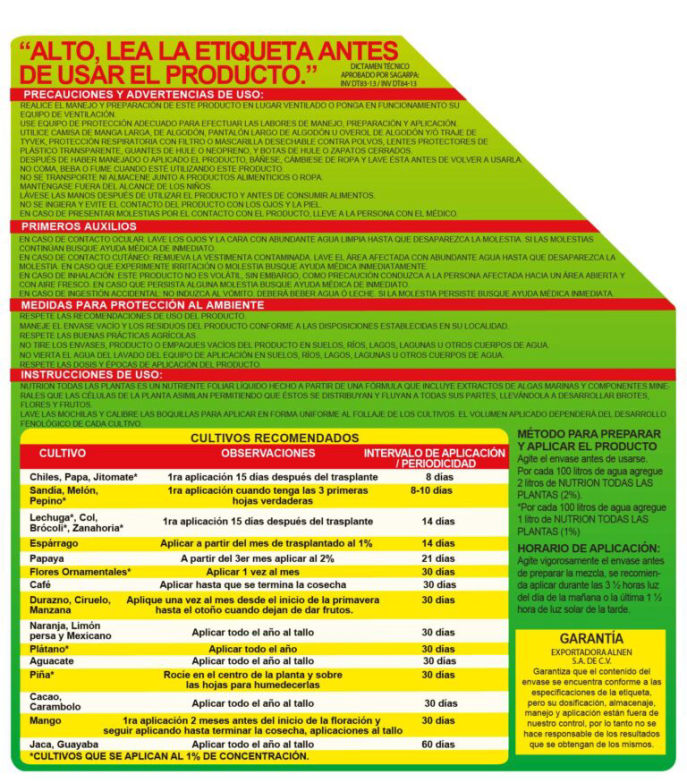 En caso de aplicar junto con insecticidas o fungicidas se recomienda tomar las precauciones requeridas por los otros productos, use máscaras para la boca y la cara y en caso de intoxicación retire a la persona a un área ventilada. Se aconseja consultar al doctor si el caso es serio. Si la solución concentrada de NUTRION TODAS LAS PLANTAS entra en contacto con sus ojos, lave meticulosamente y profundamente y consulte con su médico como medida precautoria. No lo beba. Guárdelo fuera del alcance de los niños.