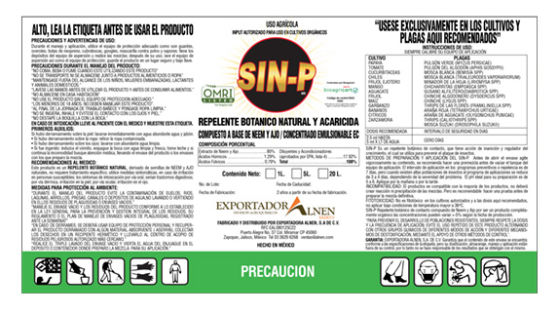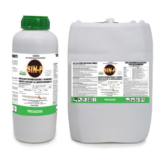 REPELENTE: se deberán aplicar semanalmente 500 ml de SIN-P en 200 litros de agua, las aplicaciones deberán ser constantes para controlar la mosca blanca, pulgones, ácaros y arañas rojas dentro de los cultivos. La presencia de estos en los cultivos debe de ser baja cuando empieces a aplicar SIN-P, este deberá aplicarse regularmente y puede mezclarse con azufre humectable o caldo zufocálcico, en cantidades de 2.5 ml de SIN-P por litro de agua más la dosis que use de productos antes mencionados, sin riesgo de quemar o intoxicar la huerta u cortar ó precipitar la mezcla.